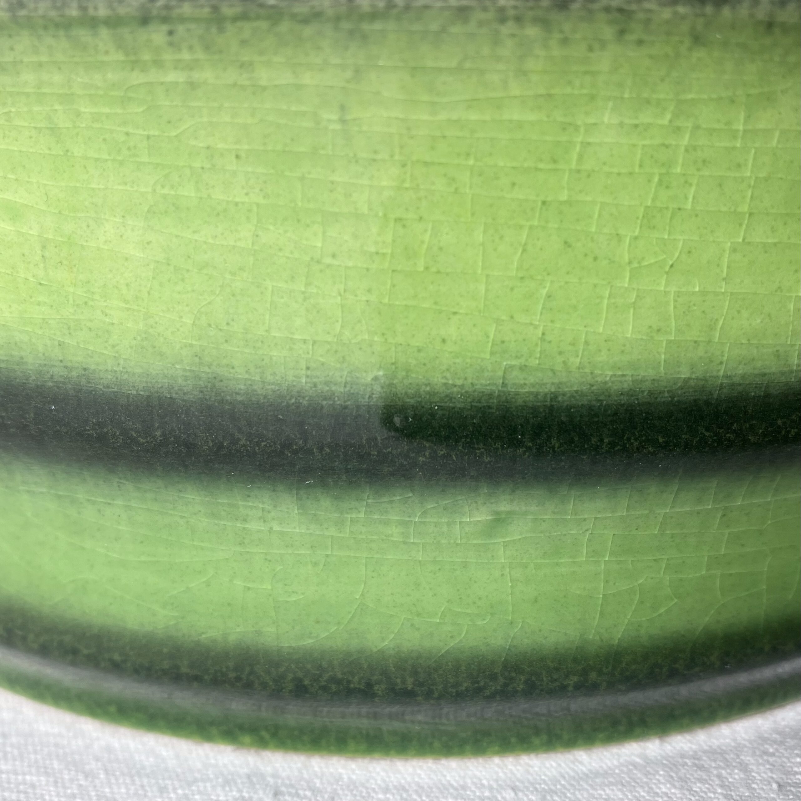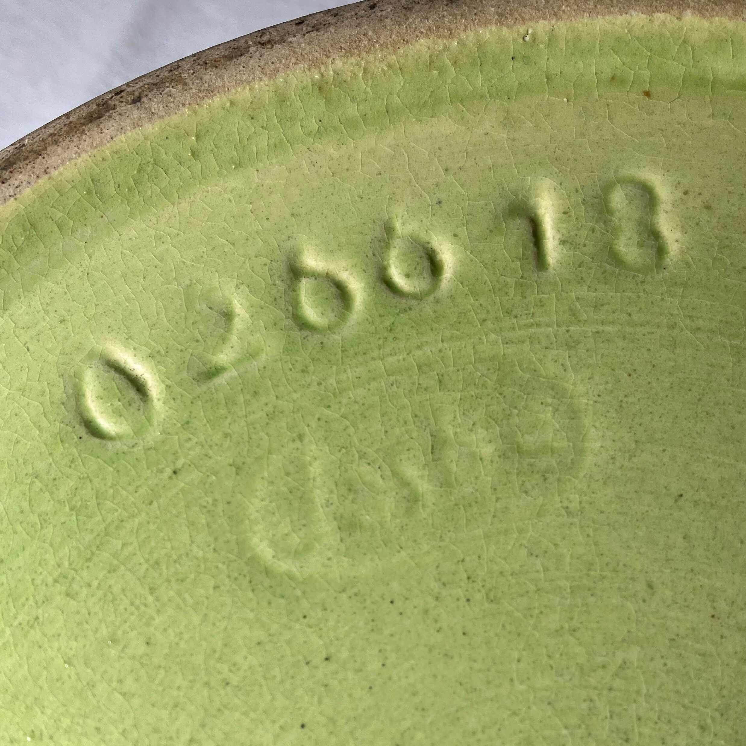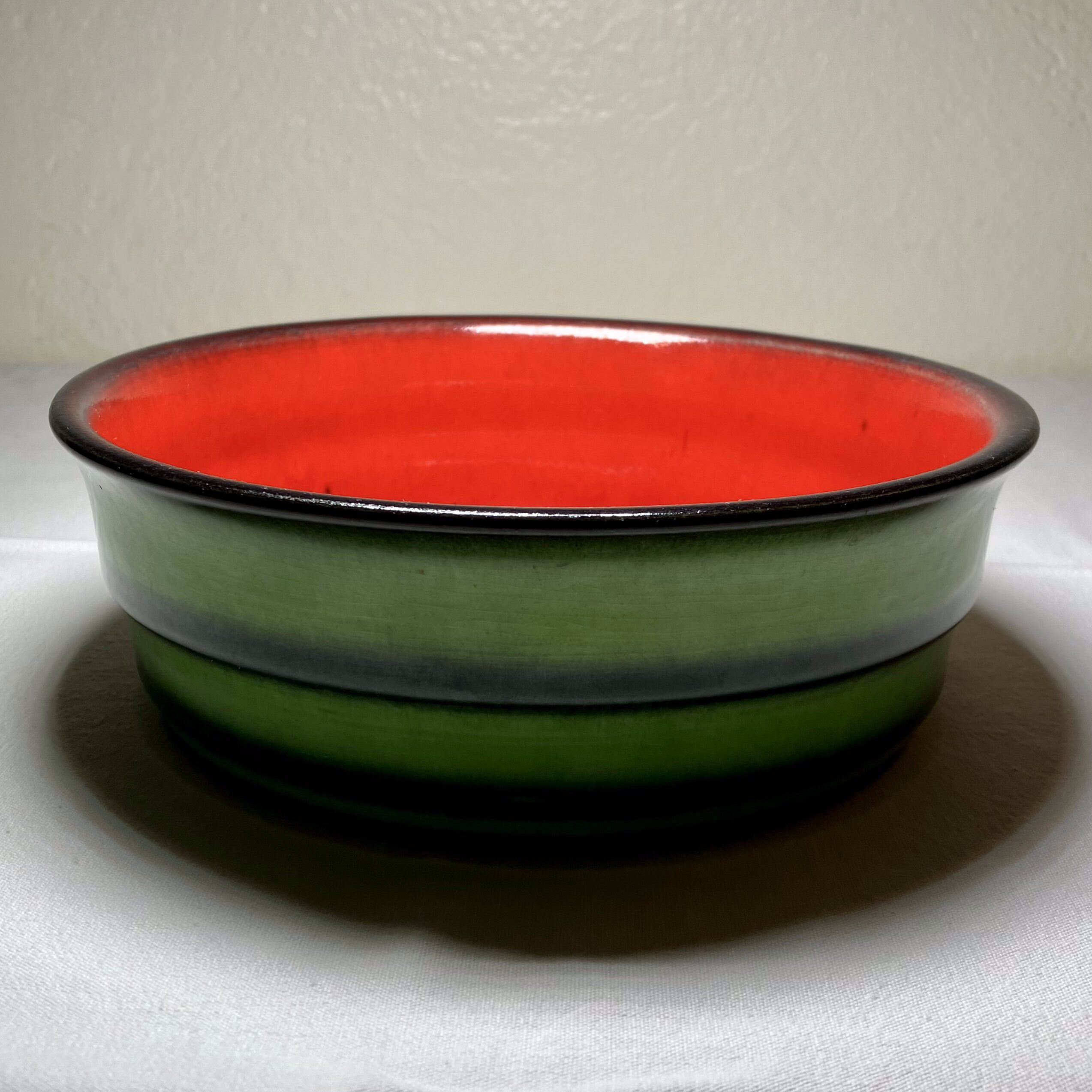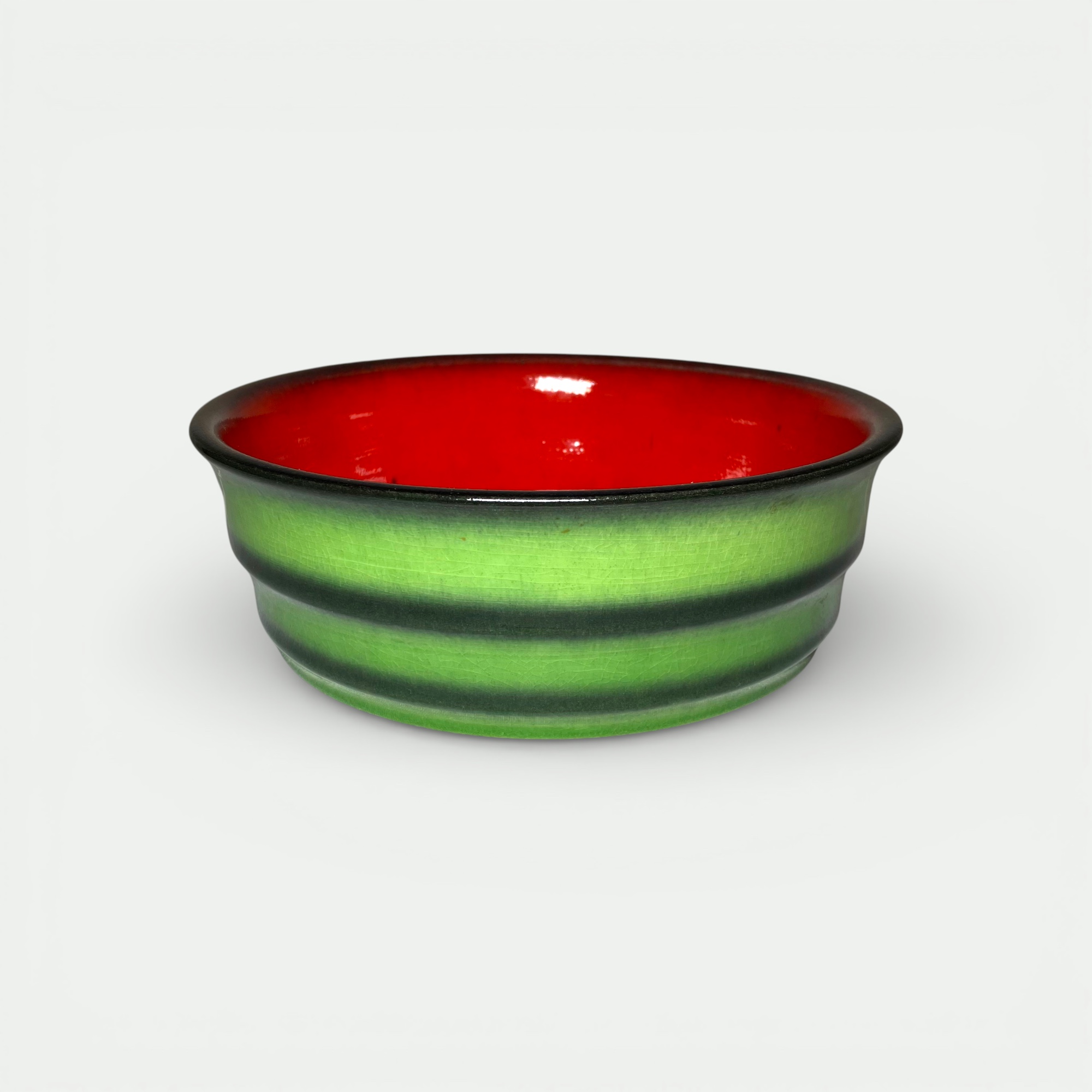 Modèle typique du style Fat Lava, avec glaçure texturée verte à l’extérieur et intérieur rouge évoquant un motif “pastèque”.