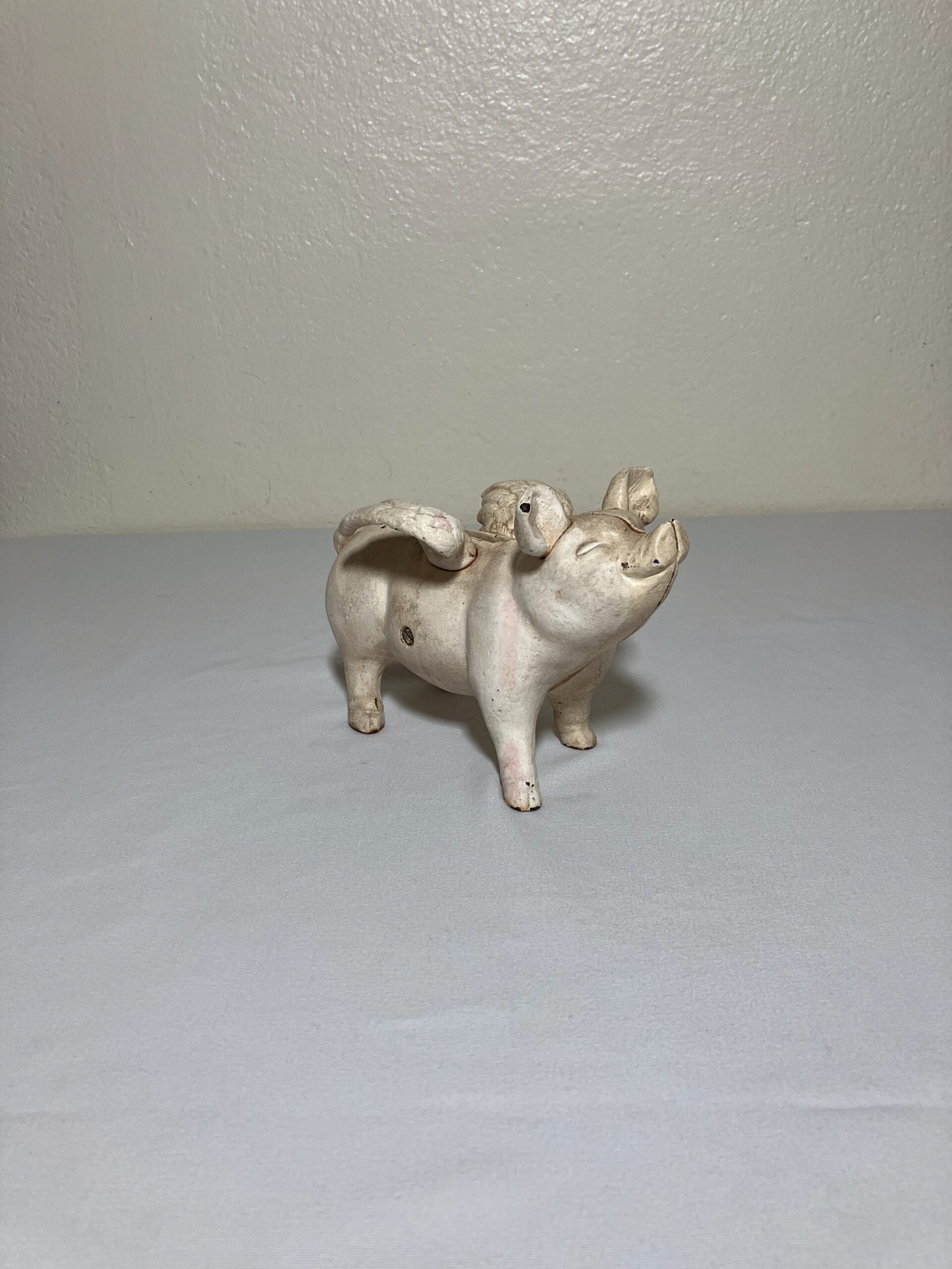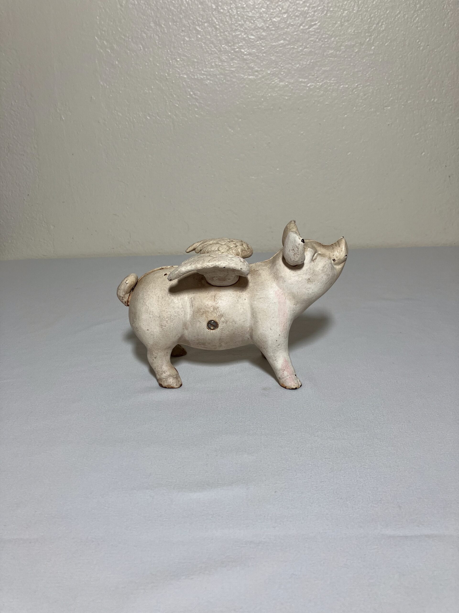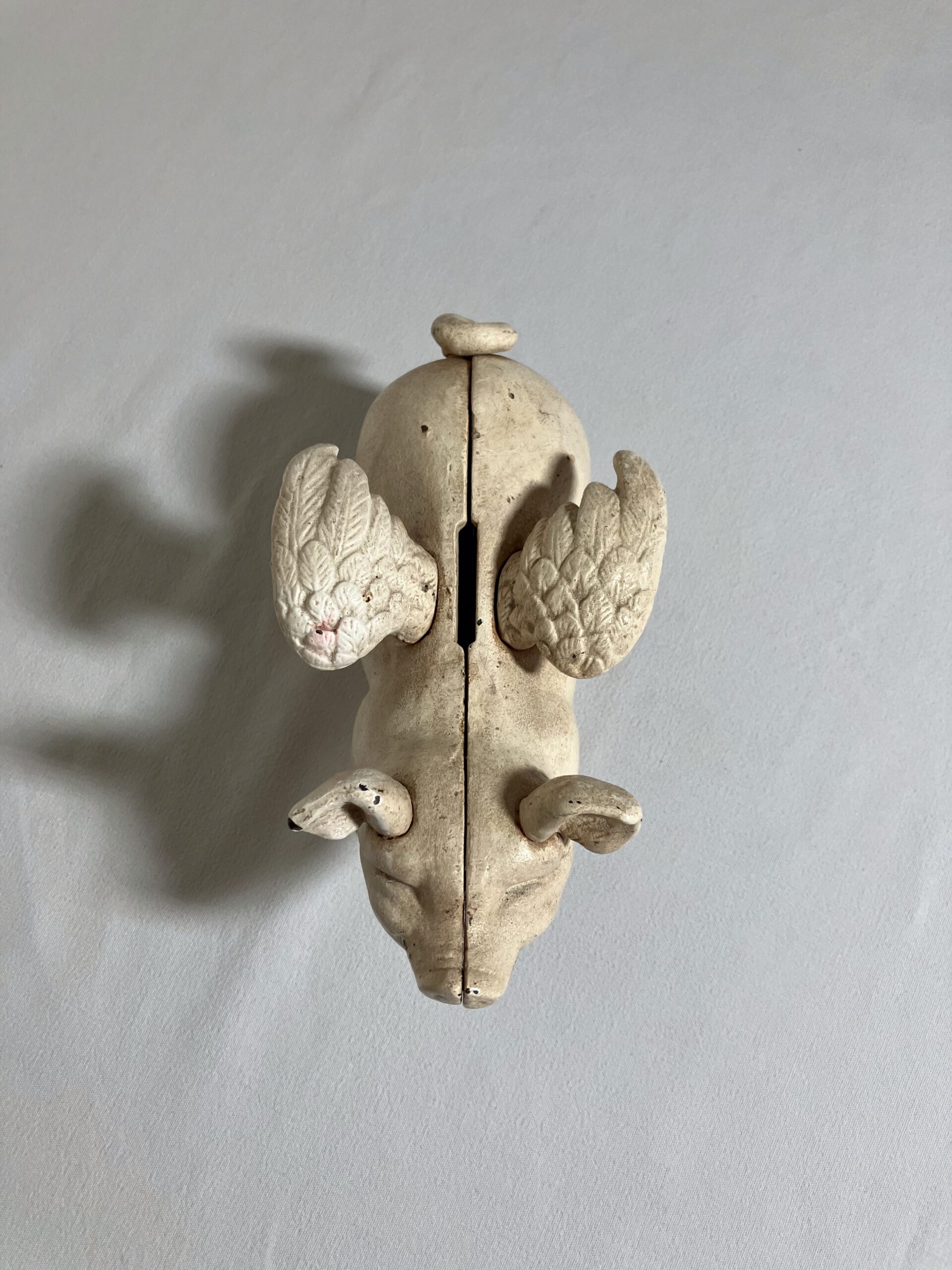 Tirelire en fonte qui s’ouvre en deux à l’aide d’une vis.