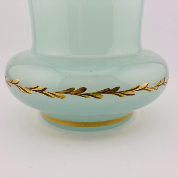 Ce joli vase en verre opale couleur vert d’eau est très élégant avec ses jolies dorures peintes à la main.